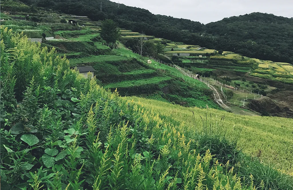 島いっぱいに広がる唐櫃棚田緑のグラデーションが海まで続き、息をのむほどの美しい風景です。